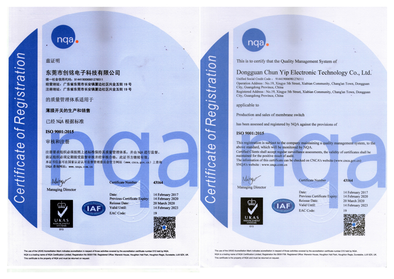 東莞市創(chuàng)銘電子科技有限公司至今已成為一家人機(jī)界面操作控制產(chǎn)品制造商,公司具有獨(dú)立設(shè)計(jì)、樣品開(kāi)發(fā)、批量生產(chǎn)、規(guī)?;?jīng)營(yíng)的一體化制作能力。我們能為客戶(hù)提供包括研發(fā)、設(shè)計(jì)到生產(chǎn)的一站式服務(wù)。隨著電子產(chǎn)品不斷更新,傳統(tǒng)的開(kāi)關(guān)控制系統(tǒng)部分將被不同形式的薄膜開(kāi)關(guān)產(chǎn)品所替代,我公司也將不斷的研發(fā)出新型產(chǎn)品來(lái)配合廣大客戶(hù)的多樣化需求。為了使公司的發(fā)展更為規(guī)范,本公司于2011年通過(guò)了ISO9001:2008認(rèn)證,使公司的生產(chǎn)控制、品質(zhì)管理、作業(yè)流程更為有序,為品質(zhì)與技術(shù)持續(xù)改進(jìn)提供了有力的保障,為促使公司的發(fā)展規(guī)范更上一層,持續(xù)的保持優(yōu)秀的品質(zhì)管理,生產(chǎn)控制,作業(yè)流程,品質(zhì)與技術(shù),7S生態(tài)工作生產(chǎn)環(huán)境;本公司于2016年申請(qǐng)升級(jí)ISO9001:2015版本通過(guò)認(rèn)證,使創(chuàng)銘電子生態(tài)規(guī)范提供了動(dòng)力,提升我們目標(biāo)客戶(hù)薄膜開(kāi)關(guān)產(chǎn)品的品質(zhì)等級(jí),增加客戶(hù)產(chǎn)品的附加值和競(jìng)爭(zhēng)力。